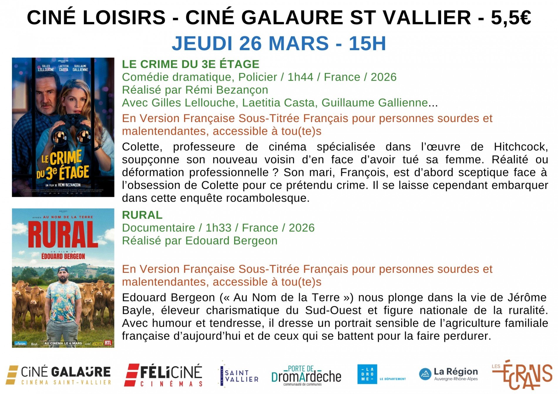 Le Ciné Galaure vous propose, à raison d'une fois par mois à l'horaire inamovible de 15h00, des séances "Ciné loisirs", ouvertes à tous, avec 2 films au choix en VFSTF (Version Française Sous-Titrée en Français pour les personnes sourdes et malentendantes) si disponibles, au tarif unique de 5,5 € par résident (1 accompagnateur gratuit pour 5 résidents).